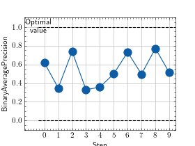 >>> # Example plotting multiple values >>> import torch >>> from torchmetrics.classification import BinaryAveragePrecision >>> metric = BinaryAveragePrecision() >>> values = [ ] >>> for _ in range(10): ... values.append(metric(torch.rand(20,), torch.randint(2, (20,)))) >>> fig_, ax_ = metric.plot(values)