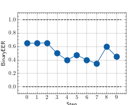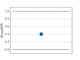 \[\text{EER} = \frac{\text{FAR} + (1 - \text{FRR})}{2}, \text{where} \min_t abs(FAR_t-FRR_t)\]The Equal Error Rate (EER) is the point where the False Positive Rate (FPR) and True Positive Rate (TPR) are equal, or in practise minimized. A lower EER value signifies higher system accuracy.