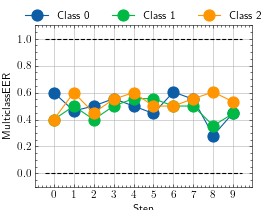 >>> # Example plotting multiple values >>> import torch >>> from torchmetrics.classification import MulticlassEER >>> metric = MulticlassEER(num_classes=3) >>> values = [ ] >>> for _ in range(10): ... values.append(metric(torch.randn(20, 3), torch.randint(3, (20,)))) >>> fig_, ax_ = metric.plot(values)