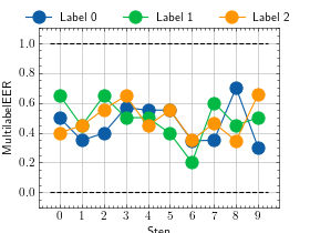 >>> # Example plotting multiple values >>> import torch >>> from torchmetrics.classification import MultilabelEER >>> metric = MultilabelEER(num_labels=3) >>> values = [ ] >>> for _ in range(10): ... values.append(metric(torch.rand(20,3), torch.randint(2, (20,3)))) >>> fig_, ax_ = metric.plot(values)