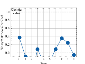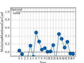 >>> from torch import rand, randint >>> # Example plotting multiple values >>> from torchmetrics.classification import BinaryMatthewsCorrCoef >>> metric = BinaryMatthewsCorrCoef() >>> values = [ ] >>> for _ in range(10): ... values.append(metric(rand(10), randint(2,(10,)))) >>> fig_, ax_ = metric.plot(values)